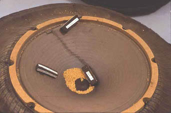 Trilogy (The Beckett Project) 1996-1999 rubber tire skins, electronic sound speakers, paper, sponges, dried wheat, cd player w/ ambient cd sound component, amplifier, (electronics not shown in photo) each stack approx. 16 x 24 inches (40.6 x 61 cm)